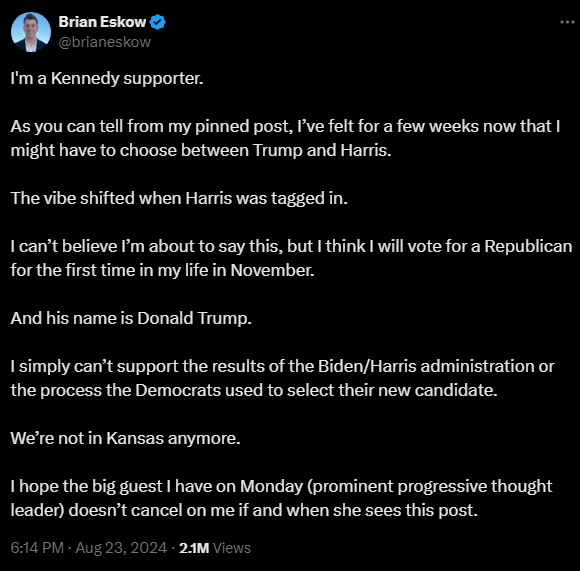 August 26, 2024: Tulsi Gabbard on X: I was a Democrat for over 20 years. Today, I endorsed Donald Trump for President. WATCH to hear why